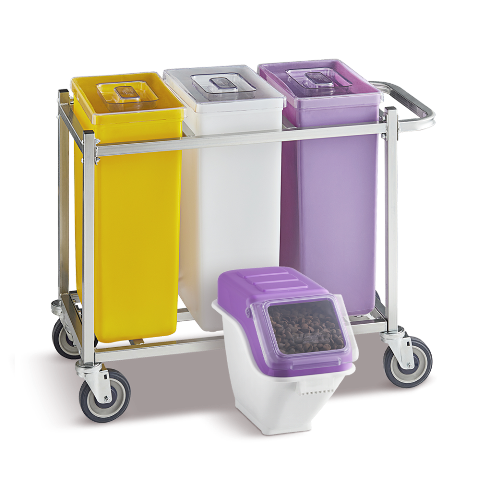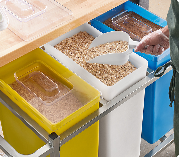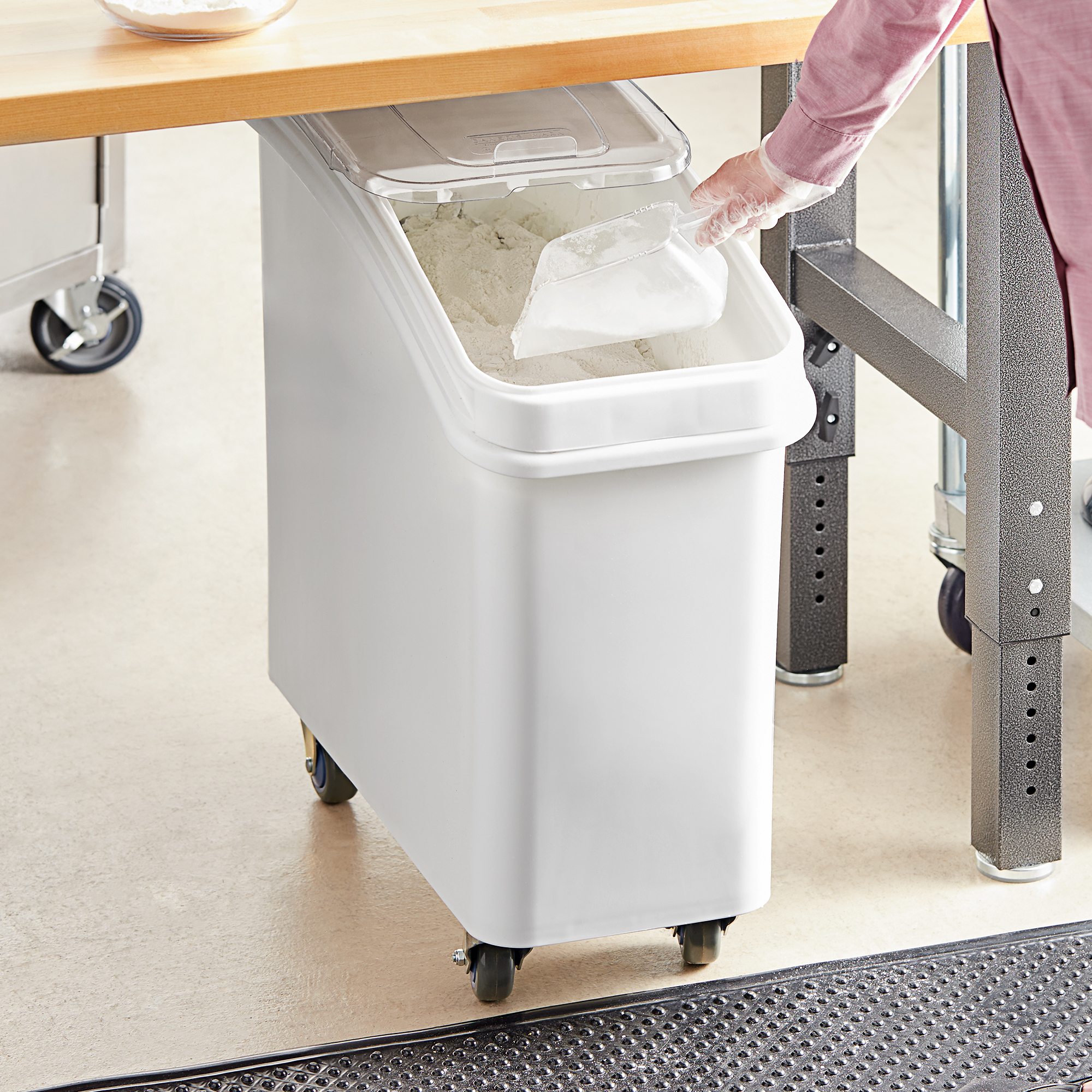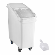 21 Gallon / 335 Cup White Slant Top Mobile Ingredient Storage Bin with Sliding Lid & Scoop