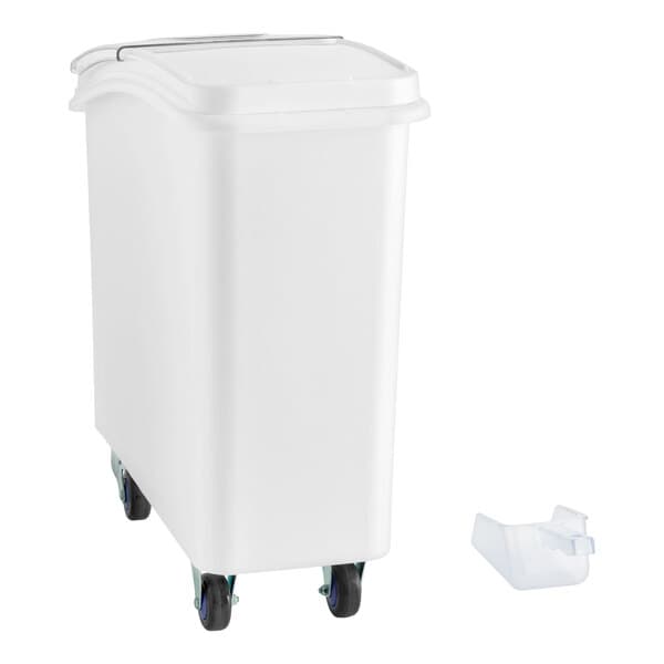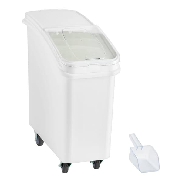 21 Gallon / 335 Cup White Slant Top Mobile Ingredient Storage Bin with Sliding Lid & Scoop