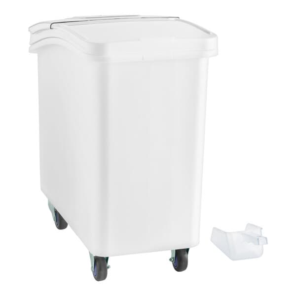 27 Gallon / 430 Cup White Slant Top Mobile Ingredient Storage Bin with Sliding Lid & Scoop