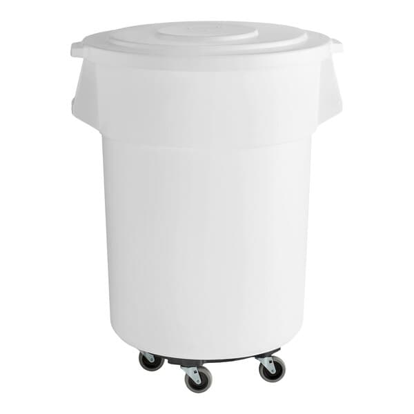 55 Gallon / 880 Cup White Round Mobile Ingredient Storage Bin with White Snap-On Lid and Gray Dolly