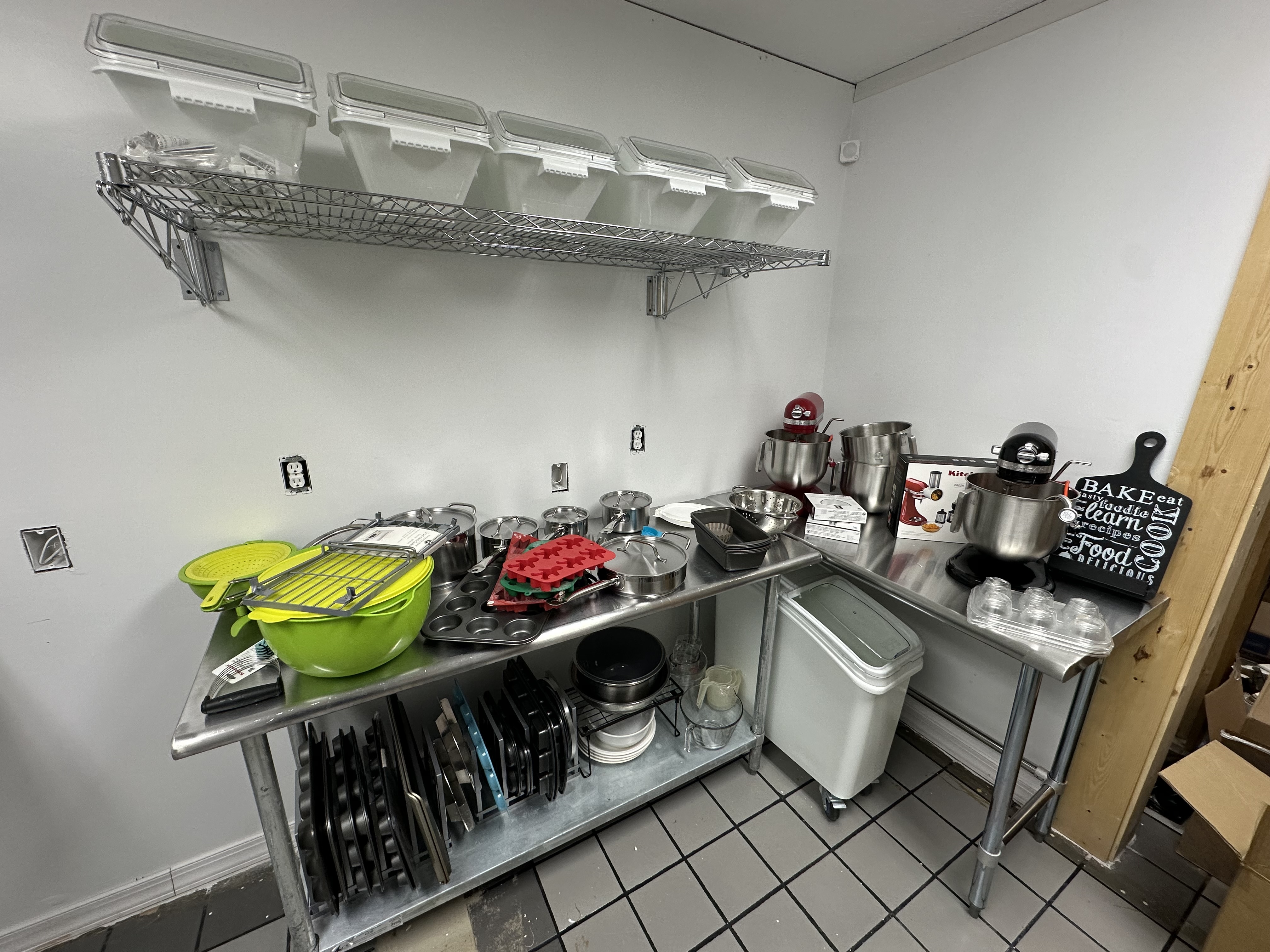 Good shelf but only came with concrete screws. I had a hard time putting it onto a wall with studs due to the standard stud distance, but I used a long board on subsequent shelves to attach to studs. So far this one has held up well and gives us additional storage area for ingredients. The metal is sturdy and easy to clean.